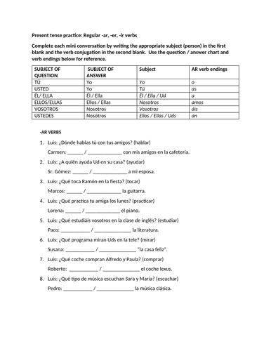 Present tense regular verbs conversation worksheet Present tense regular -ar, -er, -ir verbs conversation worksheet Complete each mini conversation by conjugating the verb in parenthesis in the first blank and adding at least 3 or more words in the second blank. T There are 8 conversations per verb type Verbs included: