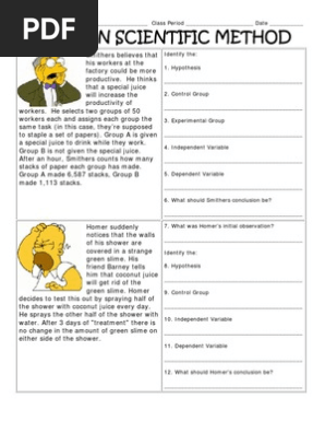 DOCX Warren Hills Regional School District Simpsons Scientific Method Practice Read the following scenarios and answer the questions based on the scientific method. Smithers believes that a special juice will increase the productivity of workers. He creates two groups of 50 workers each and assigns each group the same task (in this case, they're supposed to staple a set of papers).