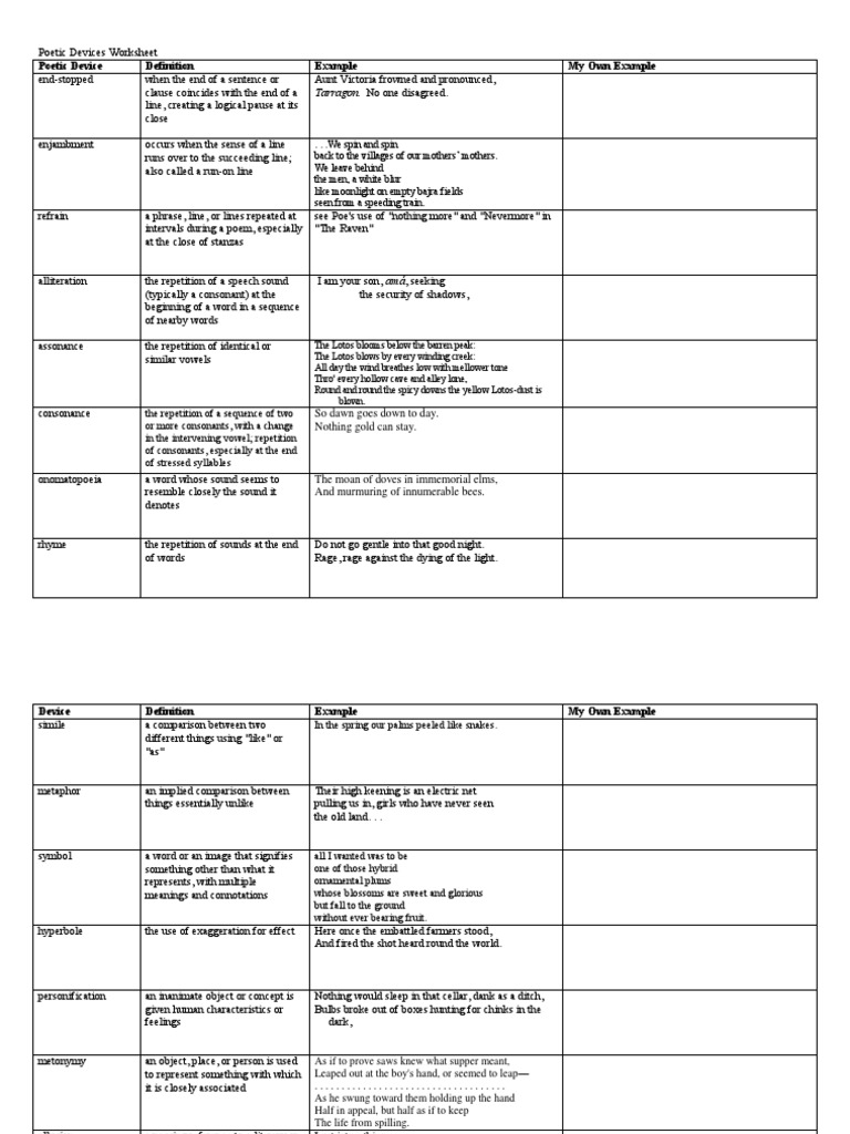 Sound devices in poetry worksheet. Physical Fitness Facts & Worksheets & Information For Kids May 30, 2019 · Physical fitness can be defined as a general state of health and well-being or more specifically as the ability to perform physical activities associated with daily life with vigor and alertness and without getting overly tired. Physical fitness is required consistent conditioning, which can be achieved through leisure activities or through structured activity. Metonymy - Examples and Definition of Metonymy - Literary Devices In this example, Shakespeare uses metonymy with the phrase “poet’s pen.” The poet, of course, is actually producing the imaginative creation. The poet forms “things unknown” into words with “a name.” However, metonymy in this passage creates an image for the reader that the source of poetry is the pen rather than the poet. Onomatopoeia Worksheets and Activities | Ereading Worksheets Onomatopoeia is when a word's pronunciation imitates its sound. Onomatopoeic words should not be confused with interjections, a part of speech, although onomatopoeic words may be used as interjection. Poets and writers use onomatopoeia to immerse readers into their poetry and to access auditory imagery. Sound Facts & Worksheets For Kids | Types Of Sounds May 26, 2022 · A sound level meter, also known as a sound pressure level meter, is a hand-held device with a microphone that is used for acoustic measurements. The microphone’s diaphragm reacts to changes in air pressure caused by sound waves. In some workplaces, sound level meters are frequently used to assess the level of unnecessary noise.