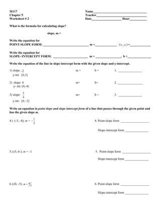 Slope intercept form. Formula , examples, video tutorial, and … Horizontal Lines. The equation of a horizontal line is y = b where b is the y-intercept.. Since the slope of a horizontal line is 0, the general formula for the standard form equation, y = mx + b becomes y = 0x + b y = b.Also,since the line is horizontal, every point on … PHSchool.com Retirement–Prentice Hall–Savvas Learning … PHSchool.com was retired due to Adobe’s decision to stop supporting Flash in 2020. Please contact Savvas Learning Company for product support. Infinite Algebra 1 - Extra Practice - Point-Slope and Slope ... Worksheet by Kuta Software LLC Algebra 1 Extra Practice - Point-Slope and Slope-Intercept Form Name_____ ID: 1 ©F J2X0B1w4w MKzu]tmah ]Sroxfgt^w_aYrrex OLRLmCd.^ t CAOlDll irTiwgLhVtwsH QrnersveZrUvlewdP.-1-Write the point-slope form of the equation of the line through the given point with the given slope. 1) through:
