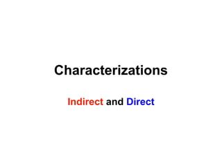 Indirect Characterizations Worksheet | Reading Activity Indirect Characterizations Worksheet Here's a fun activity to give your students some practice thinking of how to show indirect characterizations. Students define challenging character trait words, then write actions that would demonstrate each character trait. Feel free to edit this worksheet to add your own character traits. CONTROLS Edit