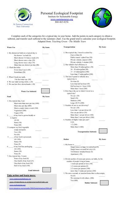 Personal ecological footprint worksheet. PDF Ecological Footprint Analysis Activity - Livingston Public Schools Compare and contrast footprint measures between developed and developing countries. Identify factors used to calculate your ecological footprint to allow you to consider ways in which you can minimize your impact on our planet. Procedure 1. Complete the manual ecological footprint survey and calculations, and then go to › resources › footprintFootprint Calculator - Measure your Impact - Global Footprint ... The Calculator is currently available in Chinese, English, French, German, Hindi, Italian, Portuguese, and Spanish. To create country-specific calculators, Global Footprint Network works with local partners to gather regional data on resource consumption. Global Footprint Network is inviting corporate, government, and NGO partners to help us ... Ecological Footprint Activity Teaching Resources | TpT My Ecological Footprint: Fun Online Activity and Worksheet about Climate Change by The Social Justice Classroom 4.8 (18) $4.00 PDF Activity Take your class to the computer lab for a fun and engaging activity! Students will use an interactive website to find out how their lifestyle determines their ecological footprint and impacts our planet. Ecological Footprint Calculator What is your Ecological Footprint? How many planets does it take to support your lifestyle? Take this free quiz to find out!