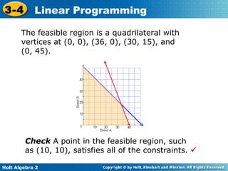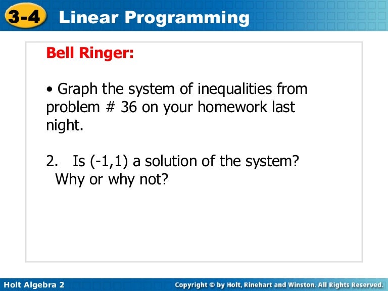 Algebra 3-4 linear programming worksheet answers. PDF ALG2 Guided Notes - Unit 3 - Systems of Equations - ANSWER KEY SECTION 3.4: LINEAR PROGRAMMING MACC.912.A-CED.A.3: Represent constraints by equations or inequalities, and by systems of equations and/!or inequalities, and interpret solutions as viable or non-viable options in a modeling context. RATING LEARNING SCALE 4 I am able to • solve problems using linear programming in real-world scenarios or more ... softmath.com › graphing-linear-inequalitiesGraphing linear inequalities calculator - softmath Solving for 2nd order equation Matlab, algebra divide polynomials, algebra with pizzazz answers. Linear programming + free graphical solver, printable pre-algebra worksheets, how to solve a radical expression, adding and subtracting like terms worksheet, holt rinehart and winston/algebra 2, algebra 1 year 7, simplifying complex polynomials. PDF 3-4 Linear Programming - Highlands School District Possible answer: Substitute the x- and y- coordinates for xand yin the two inequalities. Both inequalities must be satisfied for that ordered pair to be a solution of the system. 2. Substitute 3 for xand 2 for yin both inequalities; no, it is not a solution. 3. softmath.com › math-com-calculator › graphingProve the identity solver - softmath answers for algebra 1 prentice hall book ; graphing log base 3 ; algebra CLEP ; holt algebra 1 ; prentice hall physics exam answers ; homework worksheets for 8th grade ; maths strategies for yr 7 printable ; answers for pre-algebra chapter 13 assessment form A ; simplify rational exponents problem solvers