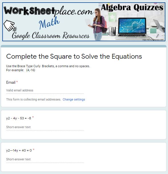 Completing the Square Worksheets Practice using completing the square and use the answers on the 2nd page to determine if you are correct. Basic and pre algebra worksheets. Grade 10 math in google quizzes. Solve the quadratic equations by completing the square for google classroom or in worksheets. Complete the Square 1 Complete the Square 2 Complete the Square 3