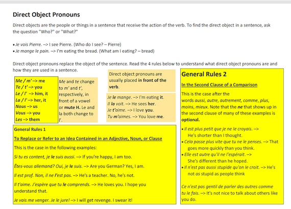Spanish Direct Object Pronouns - PDF Worksheet ... Students can work individually or in pairs to solve the exercises on this worksheet. First, this worksheet presents a brief definition of direct object pronouns in Spanish and how to use them to replace nouns in sentences. In addition, it shows a chart with the classification of these pronouns according to who we refer to and how many people.