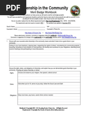 Rifle Shooting - USSCOUTS.ORG Squib fire: Rifle Shooting - Merit Badge Workbook Page. 5 of 13. Rifle Shooting Scout's Name: _____ e. Identify and demonstrate the five fundamentals of shooting a rifle safely. c 1. c 2. c 3. c 4. c 5. f. Explain to your counselor the fundamental rules for safe gun handling. Explain each rule for using and storing a gun. Identify and explain each rule for safe shooting. Rifle Shooting - … Citizenship in the Community Merit Badge and Worksheet - Boy … Requirement 6 services could include: police, ambulance, and fire departments, art centers, museums, food shelves, community gardens, mental health centers, senior centers ; Wearing a scout uniform to town meetings, interviews, and volunteer work tends to yield better results. Resources for Citizenship in the Community Merit Badge Merit Badges - Boy Scout Trail The merit badge counselor certifies completion of requirements and the merit badge patch is presented at a court of honor or troop meeting. See this page for more info on merit badges. Required Merit Badges : A scout can begin taking merit badges as soon as they join a troop, but no merit badges are required for advancement until reaching First ... Cooking Merit Badge and Worksheet - Boy Scout Trail Revised January, 2020 Requirements for the Cooking merit badge: Health and safety. Do the following: Explain to your counselor the most likely hazards you may encounter while participating in cooking activities and what you should do to anticipate, help prevent, mitigate, and …