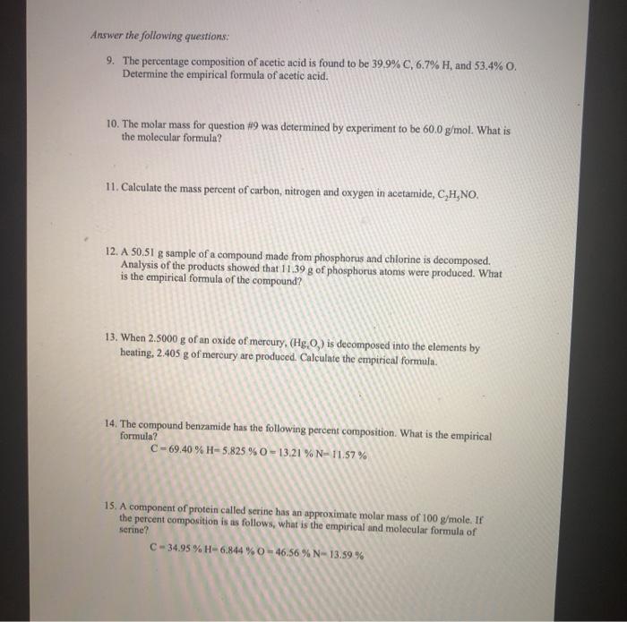 Percent composition and empirical formula worksheet. Achiever Papers - We help students improve their academic ... 100% money-back guarantee. With our money back guarantee, our customers have the right to request and get a refund at any stage of their order in case something goes wrong. Join LiveJournal Password requirements: 6 to 30 characters long; ASCII characters only (characters found on a standard US keyboard); must contain at least 4 different symbols; How to Calculate Mass Percent Composition - ThoughtCo 24.11.2019 · Mass percent composition is also known percent by weight. It is abbreviated as w/w%. It is abbreviated as w/w%. For a solution, mass percent equals the mass of an element in one mole of the compound divided by the molar mass of the compound, multiplied by 100%. Molecular Formula Practice Test Questions - ThoughtCo 01.08.2019 · The molecular formula of a compound is a representation of the number and type of elements present in one molecular unit of the compound. This 10-question practice test deals with finding the molecular formula of chemical compounds. A periodic table will be required to complete this test. Answers appear after the final question.