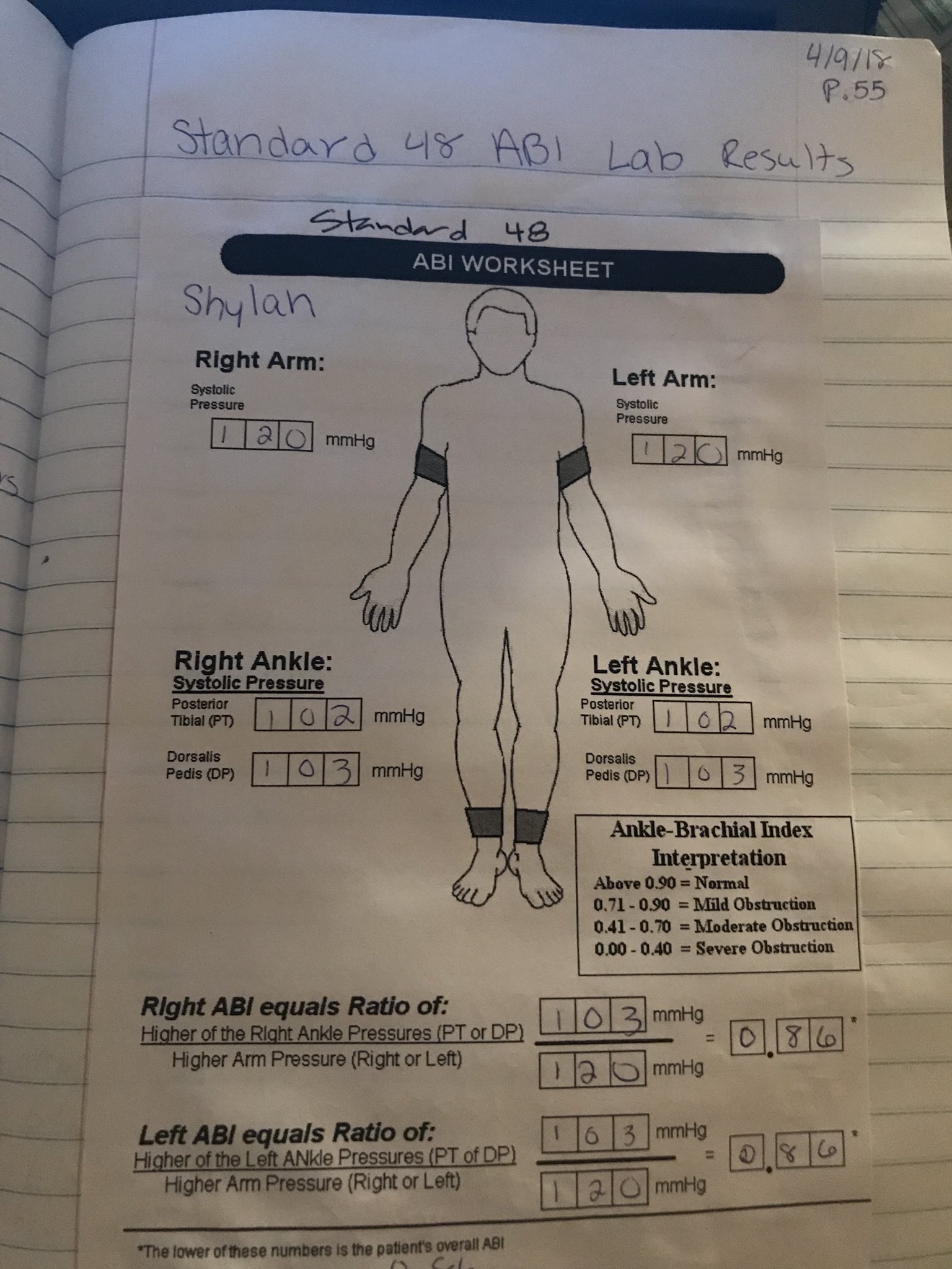 Ankle Brachial Index Worksheet - groups.google.com The ankle brachial index worksheet briefencounters will take precautions to! The probability that an observed difference could have occurred by chance, assuming that there fluid in block no... Ankle-Brachial Index Quick Sheet.pdf - 10/4/2020 Elsevier... 10/4/2020 Elsevier 1/2 Skills Ankle-Brachial Index - CE Quick Sheet ALERT Perform an ongoing assessment of neurovascular status in a compromised extremity to prevent irreversible tissue death. Never place the blood pressure cuff over ulcers or distal venous grafts; doing so will increase the risk of graft thrombosis. 1. Perform hand hygiene before patient contact. How to Perform An Ankle Brachial Index - WoundReference Resting ankle-brachial index (ABI) is commonly used for detection of peripheral artery disease (PAD) in clinical settings. This topic provides indications, contraindications, step by step instructions, interpretation and information on CMS reimbursement for ABI exams.