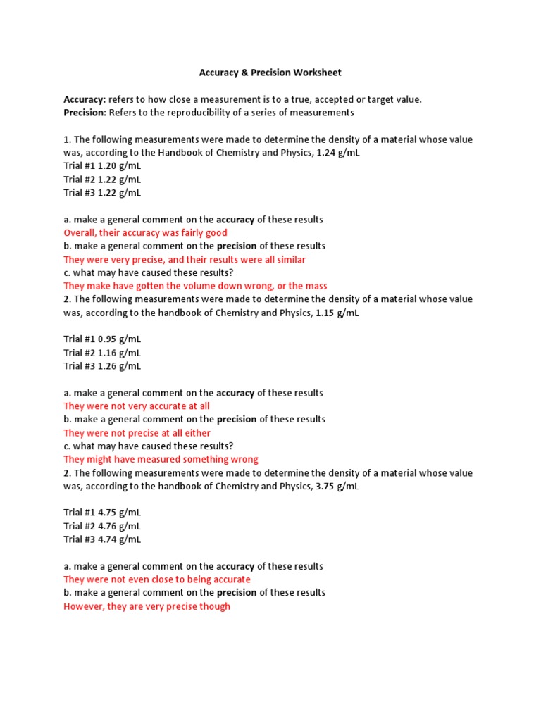 Chemistry accuracy and precision worksheet answers