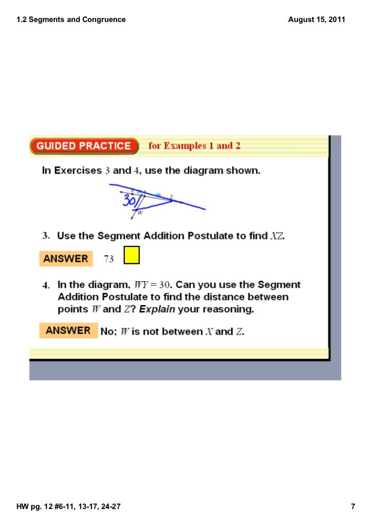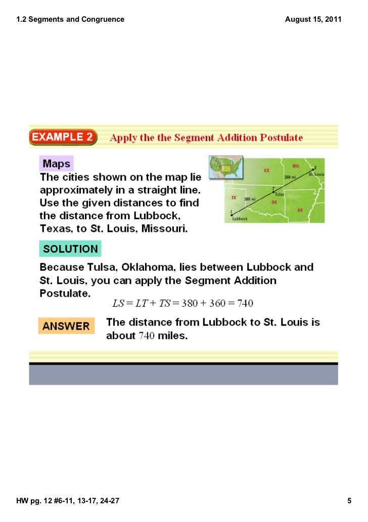 1.2 Use Segments and Congruence Lesson 1.2 s Geometry Notetaking Guide 5. 9OUR .OTES ... Goal + Use segment postulates to identify congruent ... POSTULATE 2 SEGMENT ADDITION POSTULATE.