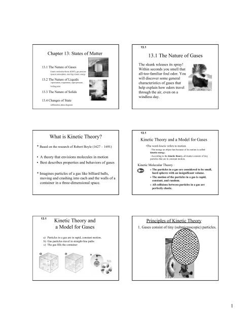 PDF Chapter 13- The States of Matter 13.1- The Nature of Gases Chapter 13- The States of Matter 13.1- The Nature of Gases Gases- indefinite volume and shape, low density. Kinetic Theory Kinetic theory says that molecules are in constant motion. Perfume molecules moving across the room are evidence of this. The Kinetic Theory of Gases Makes three descriptions of gas particles The Kinetic Theory of Gases