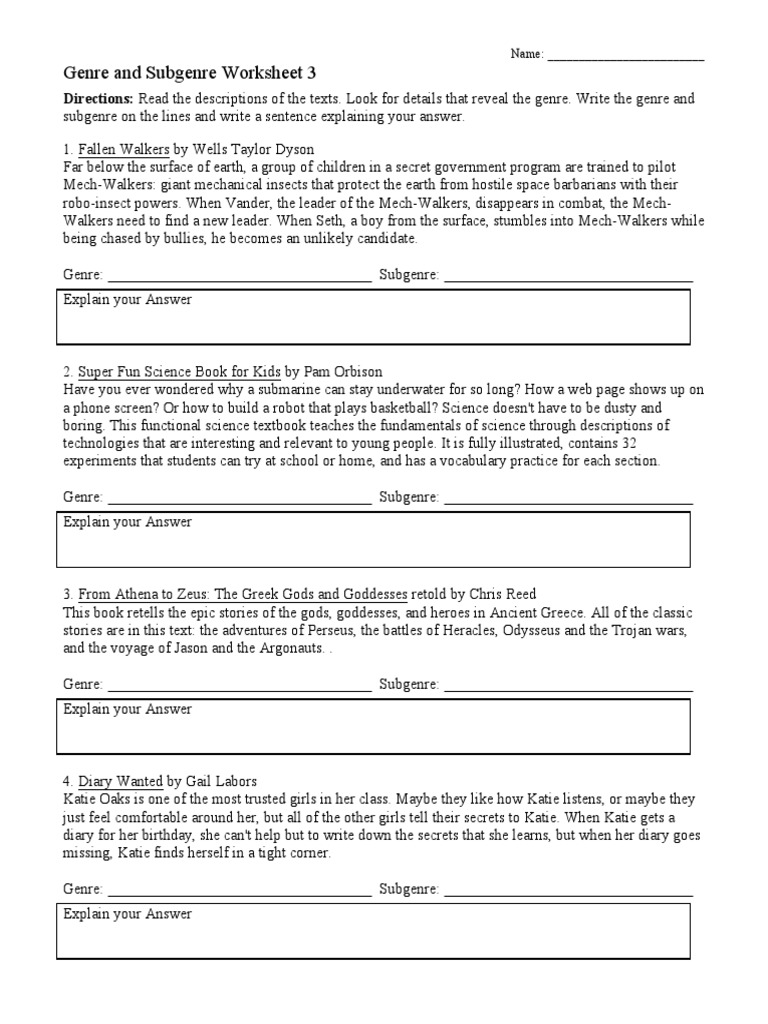 Genre Worksheet 1 | Reading Activity Look for details in each passage that reveal the genre. Write the genre and subgenre on the lines. Students also explain their answers. This is the answer key for the Identifying Genre Worksheet. - Pinterest Genre Worksheet 1 | Reading Activity. Here is a fun worksheet to help students review genre. Read the descriptions of the texts ... Genres Worksheets - Easy Teacher Worksheets In literature there are five main genres of literature: drama, fiction, poetry, prose, ... Click the buttons to print each worksheet and answer key.