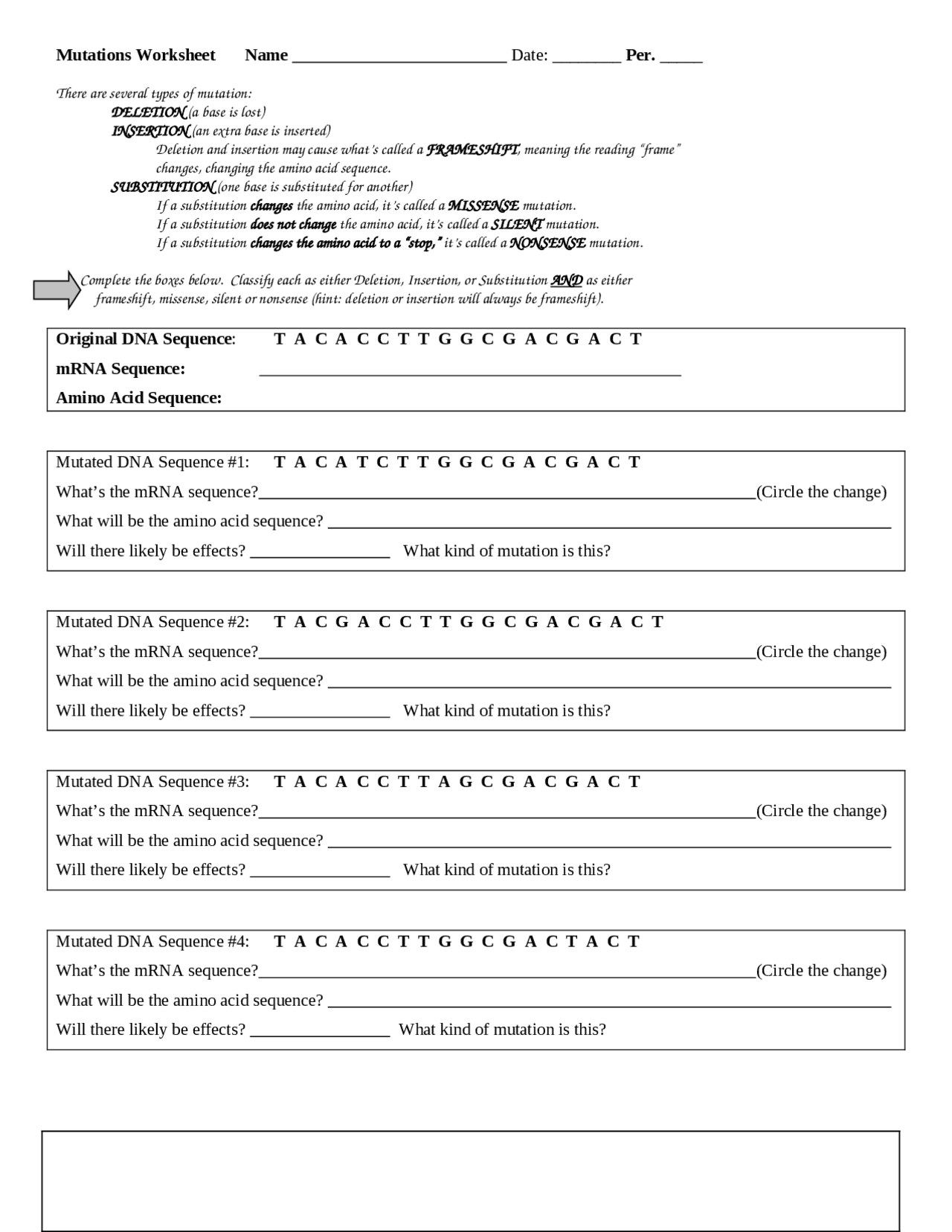 ️Dna Mutations Practice Worksheet Free Download| Qstion.co 15 Best Images Of DNA Mutations Worksheet High School A mutation in a gene causes a domino effect of change in an organism, because a change in the gene can lead to a change in the amino acid sequence, which would then change the entire protein. By missing the ads, you can even acquire workbooks to teach your youngster to create. Save Image