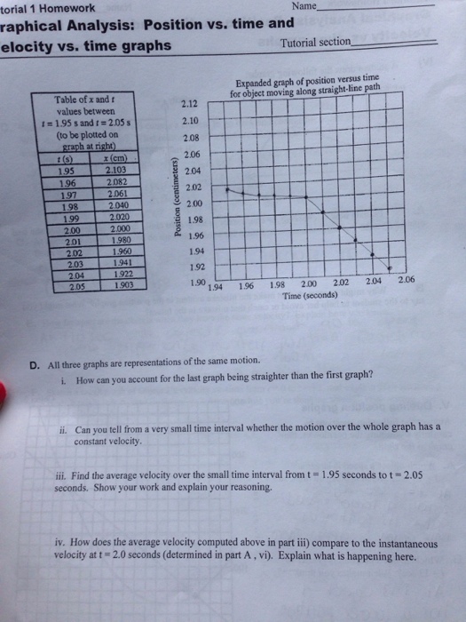 Position vs time and velocity vs time graphs worksheet answers. Power - Physics Classroom Since the expression for velocity is displacement/time, the expression for power can be rewritten once more as force*velocity. This is shown below. This new equation for power reveals that a powerful machine is both strong (big force) and fast (big velocity). A powerful car engine is strong and fast. A powerful piece of farm equipment is strong ... Unit 2 Kinematics Worksheet 1: Position vs. Time and Velocity vs. Time ... Unit 2 Kinematics Worksheet 1: Position vs. Time and Velocity vs. Time Graphs Sketch velocity vs. time graphs corresponding to the following descriptions of the motion of an object: 1. The object moves toward the origin at a steady speed for 10s, then stands still for 10s. There are 2 possibilities: a) (in red ) object moves toward origin in positive direction so it starts on negative … Unbanked American households hit record low numbers in 2021 25.10.2022 · Those who have a checking or savings account, but also use financial alternatives like check cashing services are considered underbanked. The underbanked represented 14% of U.S. households, or 18. ... Physics Quizzes | Study.com 2,000,000+ Questions and Answers ... Position & Speed vs Time Graphs . View Quiz. Qualitatively Describing Graphs of Motion . View Quiz. Series Circuits & Voltage Drops . View Quiz. Special ...