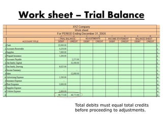 › course › tax-adjusting-entry-yearTax & Adjusting Entry Year-End Accounting Excel Worksheet Create a new Excel worksheet from scratch to be used in the adjusting and tax entry process. This course is most beneficial to tax preparers and public accountants who enter adjusting entries but is also useful to anybody in accounting. Similar Excel worksheets to the ones we will construct can be useful for analyzing many areas of accounting, and the Excel skills learned in creating t Accounting Worksheet | Format | Example | Explanation Format. The accounting worksheet is essentially a spreadsheet that tracks each step of the accounting cycle. The spreadsheet typically has five sets of columns that start with the unadjusted trial balance accounts and end with the financial statements. In other words, an accounting worksheet is basically a spreadsheet that shows all of the major steps in the …