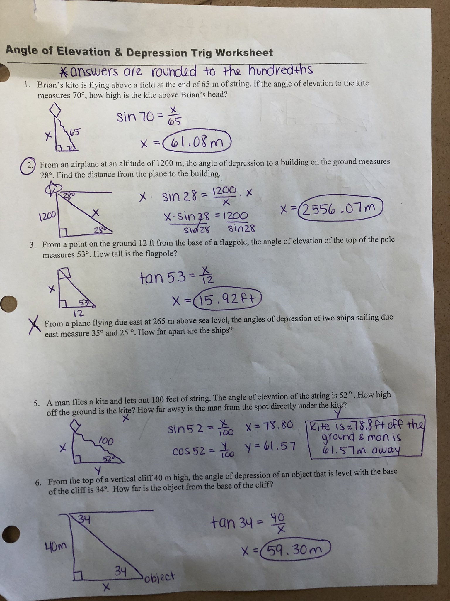 PDF Angle of Elevation and Depression Worksheet - San Juan Unified School ... Angle of Elevation & Depression Trig Worksheet *Draw and label a picture for each problem 1. Brian's kite is flying above a field at the end of 65 m of string. If the angle of elevation to the kite measures 70°, and Brian is holding the kite 1.2 m off the ground. How high above the ground is the kite flying? 2.