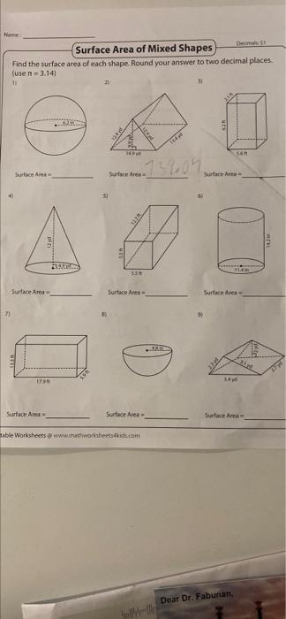 PDF Surface Area - Mixed Shapes - Mr. Barnes' Classroom Printable Math Worksheets @ Find the surface area of each shape. Round the answer to nearest tenth. ( use ! = 3.14 ) 40 cm 33 in 34 in 42 in 22 ft 22 ft t 21 m 42 m 29 mm 24 mm 13 mm 24 ft 27 ft t t 29 m t 18 m 35 m 36 in 43 in 35 in 35 in 33 m Surface Area - Mixed Shapes 1) Surface Area = 2) Surface Area = 3 ...