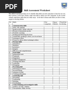 12+ Skills assessment templates - Word Excel PDF Formats 12+ Skills assessment templates Written by meadmin in Templates for Word Assess your skills yourself by means of an appropriate skills assessment template. Utilization of the skills assessment template equipped with all essential material and contents make the skills assessment process fluent for any individual person or company. PDF SKILLS ASSESSMENT WORKSHEET - The Graduate School of Political Management This worksheet is designed to assist GSPM Students in learning and determining what types of skills are required for the myriad of job opportunities in the fields of political management, legislative affairs, and public relations. Most of the jobs in these fields require many of the same skills. Some of the common skills required are outlined ...