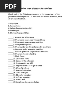 Review Over Glucose Metabolism | PDF - Scribd Review over Glucose Metabolism Match each of the following occurrences to the correct part of the glucose metabolism process. If more than one answer is correct, write all letters in the blank. A. Glycolysis B. Fermentation C. Cellular Respiration (aerobic) D. Krebs Cycle E. Electron Transport Chain _____1. Most of the ATP is made _____2.