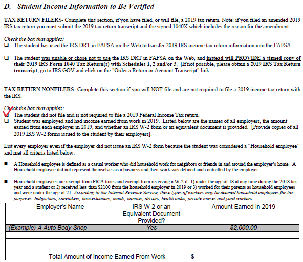 Verification worksheet for dependent students