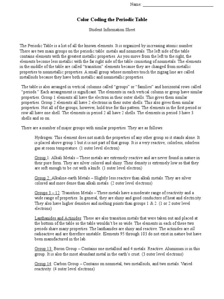 Elements and their properties worksheet answers. Chapter 17 Elements and Their Properties Flashcards | Quizlet a - element is one in which the nucleus breaks down and gives off particles and energy radioactive elements in groups 3 through 12 on the periodic table are known as - elements transition the two rows of elements that seem to be disconnected from the rest of the periodic table are the - inner transition metals Identifying Unknown Elements Worksheet Answer Key After the unknown elements worksheet answer key. The students perform a lab to test and identify four unknown samples. Use the Ideal Gas Law equation to find the identity of an unknown gas. That is it can be drawn into a wire and can be hammered into a thin sheet. Identify unknown elements based on their properties of atomic radius. Elements And Their Properties Worksheet Answers Elements And Their Properties Worksheet Answers, free sex galleries elements and their properties worksheet answers, printable periodic table of elements with names forms and Elements And Their Properties Worksheets - Learny Kids Some of the worksheets for this concept are Solutions work for chemistry, Periodic table work and answer keys, Organizing the elements workbook, Science stars 5th grade lesson plan lego molecules, Mystery elements work answers, Types of solutions work, Chapter 1 properties and uses of metal, Geology laboratory mineral properties.