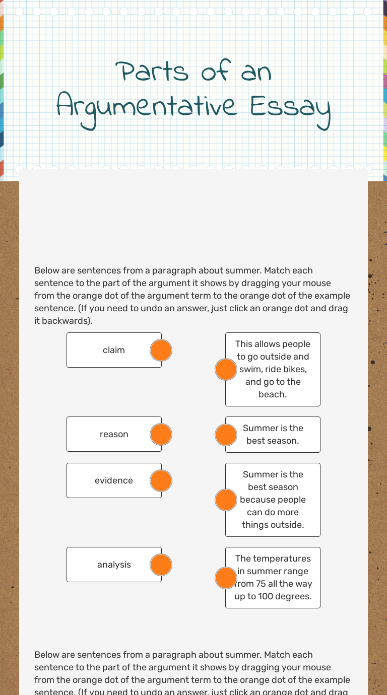 Argument Writing: Parts of an Argument | Worksheet - Education Worksheet Argument Writing: Parts of an Argument What are the important parts of any argument? Introduce your students to the five parts of an effective argument and help give them the tools to become better writers. For additional practice, try using the other resources in the Argument Writing series. Download Free Worksheet View answers Parts Of An Argumentative Essay Review Worksheet offers three types of essay writers: the best available writer aka. standard, a top-level writer, and a premium essay expert. Every class, or type, of an essay writer has its own pros and cons. Depending on the difficulty of your assignment and the deadline, you can choose the desired type of writer to fit in your schedule and budget. PDF Parts of an Essay - The Writing Center PARTS OF AN ESSAY . Introduction—An essay begins with a brief introduction, which prepares the audience to read the essay. An effective introduction should: • Catch the reader's attention, which can be done, for example, by using a direct announcement, a quotation, a question, a definition, an unusual comparison, or a controversial position; Essay writing worksheets and online exercises A travel Experience. Grade/level: intermediate. by Cflorencia2124. A cat and a dog. Grade/level: 3. by Dharrsheni. Section C - Question 1 Essay writing. Grade/level: grade 4-6. by sharonchin.