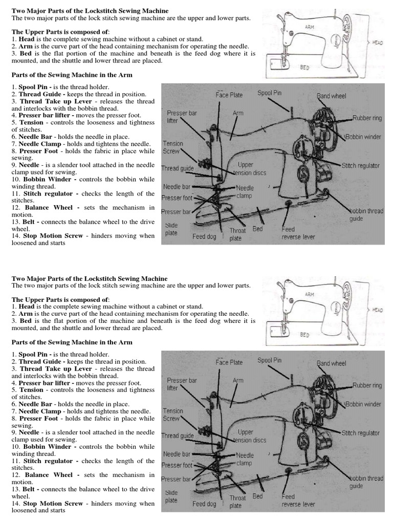 Lesson Plan - Parts of the Sewing Machine - WELCOME! Teaching Process. The students then took a Parts of a Sewing Machine handout and working with a partner they will locate the various parts of the machine. This worksheet was corrected in a group setting. Students will view a youtube video on How to thread a Janome Sewing Machine by Peterson. They will thread the machine alone or with a partner.