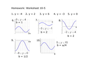 › highered › contactHigher Education Support | McGraw Hill Higher Education Learn more about McGraw-Hill products and services, get support, request permissions, and more. Trig Graphs Worksheet - SharpSchool State the equations for the following graphs. Amplitude = ______. Period = ______. Phase Shift = ______. Equation (1) = (in terms of the cosine ... › worksheets › linear-equationsWriting Equations of Lines from Graphs Worksheets Equations of Lines from Graphs | Worksheet #1 To find the equation that the graph represents, observe the line, identify the y-intercept (b), and determine the slope (m). Then, rewrite the equation in the form y = mx + b. It doesn't need to be any more complicated than this. Equations of Lines from Graphs | Worksheet #2