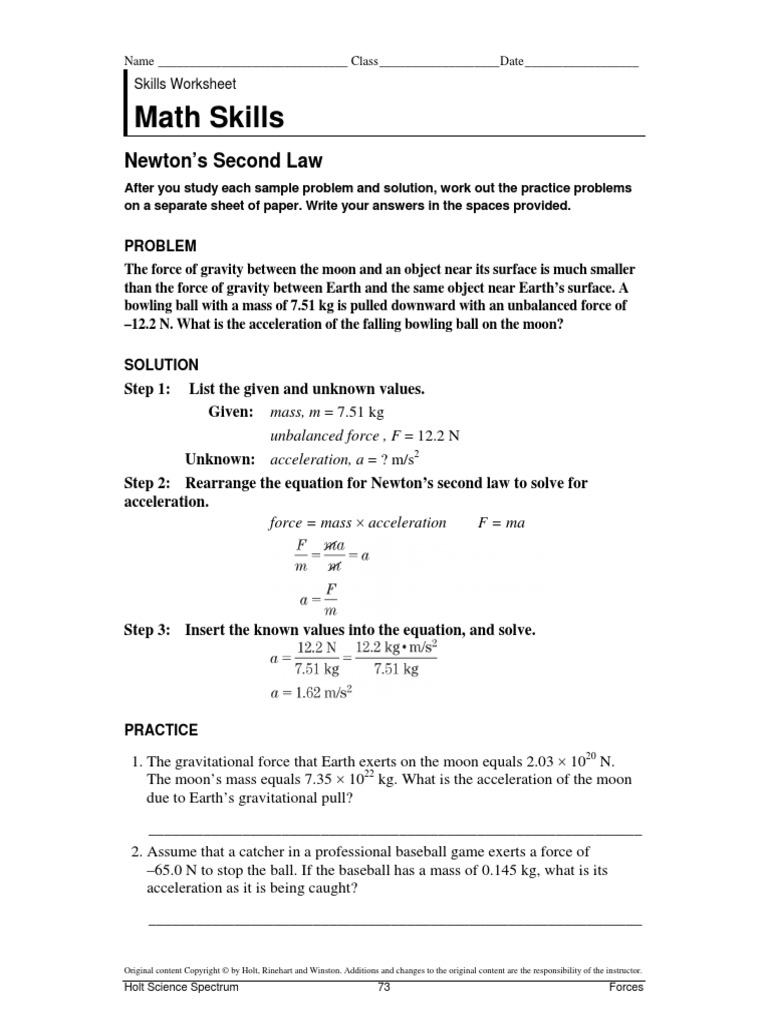 Newton's 2nd Law Worksheet KEY - WordPress.com Newton's Laws. Name: KEY. Balanced vs. Unbalanced Forces. Read from Lesson 1 of the Newton's Laws chapter at The Physics Classroom:. Lesson Worksheet:Newton's Second Law of Motion - Nagwa Give your answer to two significant figures. Q3: An object of mass 1.5 kg has a force of 4.5 N ... Newton's Laws Worksheet KEY KEY. Period: KEY. NEWTON'S LAWS WORKSHEET - KEY. I. NEWTON'S FIRST LAW OF MOTION ... Newton's second law of mojon is also known as the LAW OF ACCELERATION.