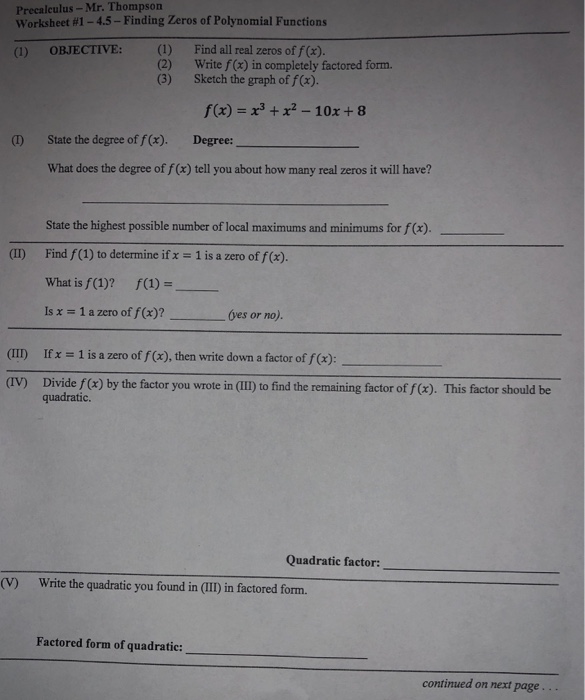 finding zeros by factoring worksheet Polynomial function: finding zeros and write in factored form. Quadratic function worksheets. Polynomial graphs graph functions graphing polynomials function worksheet math sketching sketch algebra drawing drawings roots linear paintingvalley answer classroom visit Infinite Precalculus - Kuta Software WebTest and worksheet generator for Precalculus. Create customized worksheets in a matter of minutes. Try for free. ... real zeros, and end behavior of polynomial functions . ... Product-to-Sum and Sum-to-Product Identities - Finding exact value never gave sum/diff Fixed: Equations of Parabolas - Sign of coefficient wrong in a certain cases ... finding zeros of polynomial functions by factoring Browse finding zeros of polynomial functions by factoring resources on Teachers Pay Teachers, a marketplace trusted by millions of teachers for original educational resources.