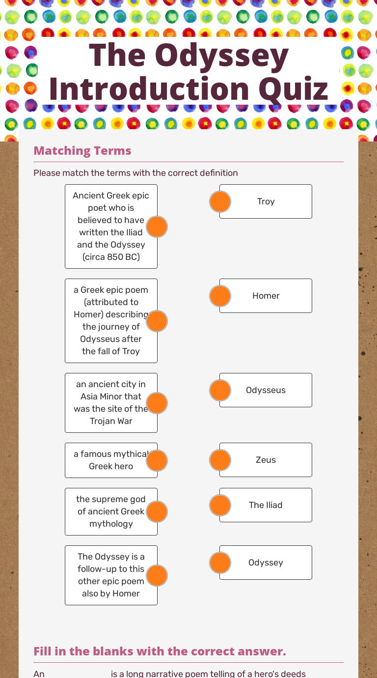 The Odyssey Worksheet - WordMint A printable the odyssey worksheet containing 13 questions and answers to match. Add your own questions.