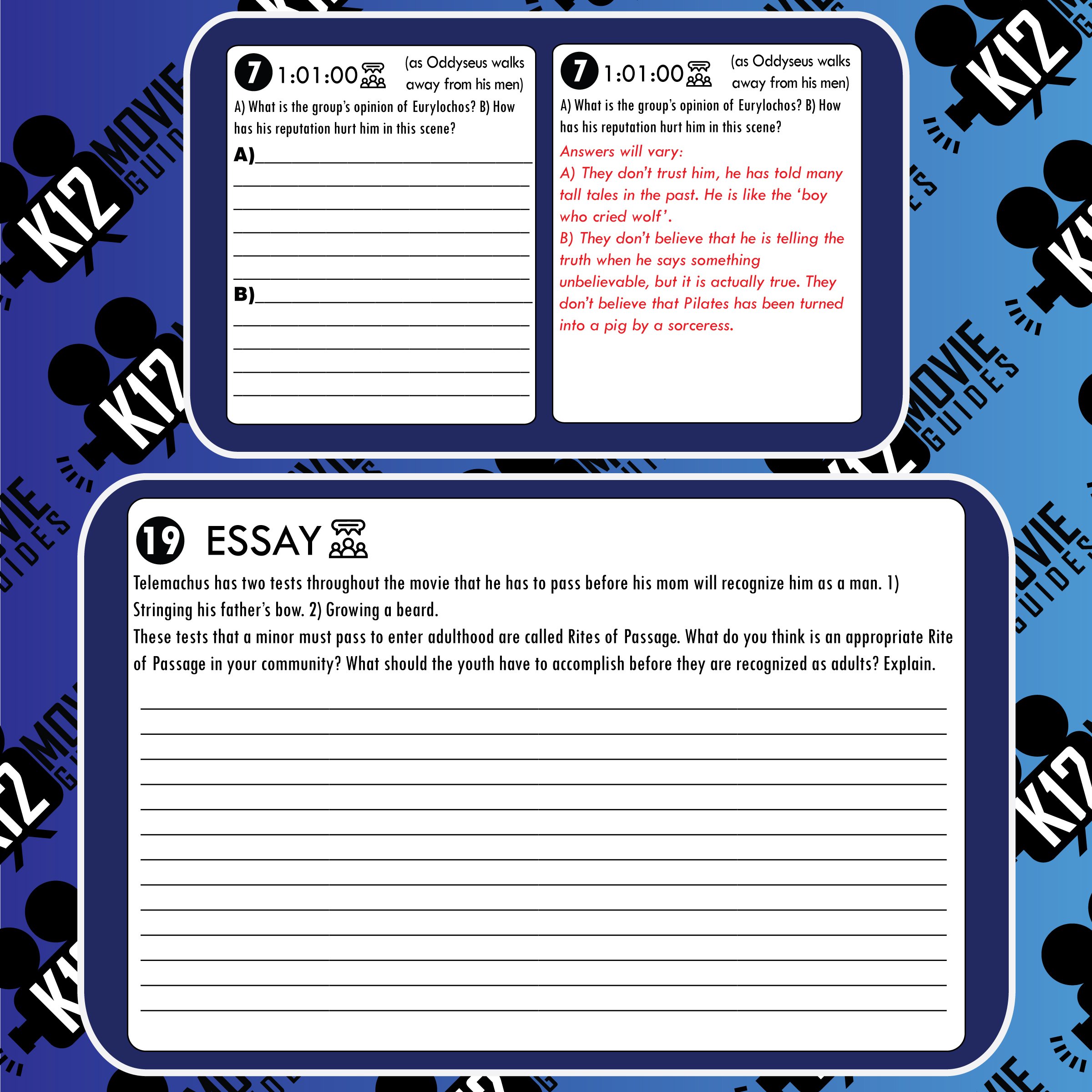 the odyssey movie questions and answers - TeachersPayTeachers THE ODYSSEY: Movie Questions by KnowStuff $2.00 PDF Activity After reading The Odyssey with your class, show the movie and give your students these questions to guide their thinking during the film (1997 version with Armand Assante and Vanessa Williams). Answer Key:1. Queen Penelope2. Telemachus is born.3. King Agamemnon and King Menelaus4.