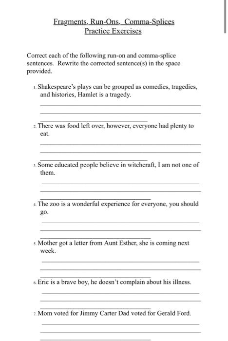 Online Writing Lab - Run-on Sentences, Exercise 1 - dyc.edu Complete sentence. 2.) My cat was upset all day he didn't get canned food for breakfast. a.) Run-on. b.) Complete sentence. 3.) Organizations that promise students a scholarship if they pay an extraordinarily high application fee are most likely scams. Run-on sentences worksheets | K5 Learning Grammar worksheets: the problem of run-on sentences. Run on sentences combine more than one idea without the proper punctuation or joining words. In these worksheets, students break up run-on sentences into two proper sentences. Worksheet #1 Worksheet #2 Worksheet #3. Run-on Sentences Worksheets - EnglishForEveryone.org Run-on Sentences Worksheets. This page contains printable worksheets outlining run-on sentences and how to avoid them. Included are explanations and examples of the different kinds of run-on sentences. Practice involves correcting run-on sentences using various techniques provided in the explanation. Learning the information contained in these ... Fragment, run-on or sentence? | K5 Learning Sentences worksheets: identifying fragments and run-ons. Sentence fragments do not express a complete thought. Run-on sentences combine thoughts without the proper punctuation or joining words. In these worksheets, students identify sentence fragments and run-on sentences. Worksheet #1 Worksheet #2 Worksheet #3.