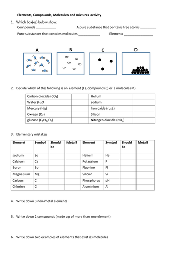 Elements compounds and mixtures worksheet