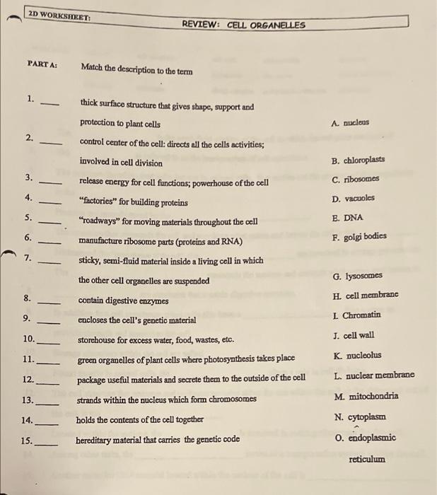 Cell Organelles Matching Worksheet Teaching Resources | TpT A great resource to keep on hand during your cells unit.Students Will:Match the function of the following organelles: chloroplast, nucleus, mitochondria, cytoplasm, vacuole, cell membrane, lysosome, cell wall, golgi body, endoplasmic reticulum, and ribosome.Included in this Resource:- One organelles matching worksheet- One answer keyTerm Subjects: Parts of the Cell – Matching Parts of the Cell - Matching Match the descriptions in Column 1 with the name in Column 2. Column 1 Column 2 _____ 1. holds the nucleus together a. Golgi Bodies _____ 2. surface for chemical activity b. nucleus _____ 3. Units of heredity c. chromosomes _____ 4. digestion center d. vacuole _____ 5.