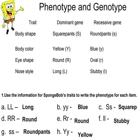 Bikini Bottom Genetics 2.docx - Google Docs Bikini Bottom Genetics 2 Use your knowledge of genetics to complete this worksheet. 1. Use the information for SpongeBob's traits to write the phenotype (physical appearance) for each item. Characteristic Dominant Gene Recessive Gene Body Shape Squarepants (S) Roundpants (s) Body Color Yellow (Y) Blue (y) Eye Shape Round (R) Oval (r)
