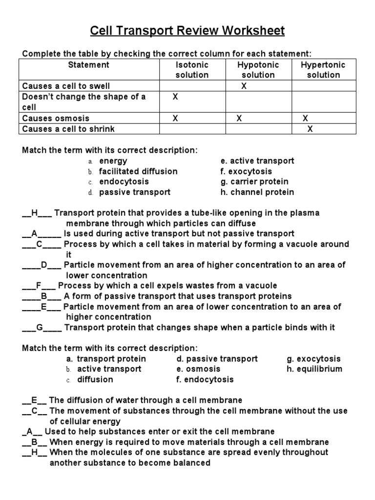 Cell Transport Review KEY - Cell Transport Review Worksheet … Cell Transport Review Worksheet. Complete the table by checking the correct column for each statement: Statement Isotonic solution Hypotonic solution Hypertonic solution. Causes a cell to swell Doesn’t change the shape of a cell. Causes osmosis. Causes a cell to shrink. Match the term with its correct description: a. energy e. active transport