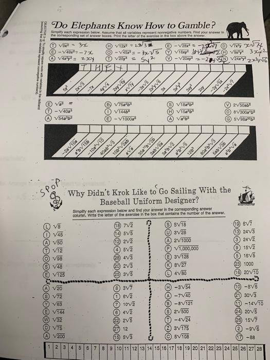 Do elephants know how to gamble worksheet answer key. Do Elephants Know How To Gamble Worksheets - K12 Workbook Displaying all worksheets related to - Do Elephants Know How To Gamble. Worksheets are Do elephants know how to gamble answers, 2012 camille saint sans, Flat bread technology. *Click on Open button to open and print to worksheet. 1. Do elephants know how to gamble answers 2. 2012 Camille Saint-Sans 3. |||FREE||| Flat Bread Technology Download PDF GDo Elephants Know How to Gamble ? Simplify each expression ... - Weebly GDo Elephants Know How to Gamble ? Simplify each expression below. Assume that all variables represent nonnegative numbers. Find your answer in the corresponding set of answer boxes. Print the letter of the exercise in the box above the answer. @ 25y4 75a2b3 7x2y 9x2y4Z 2Sxg (D 144b6 @ 8 300a4b6 40 a 3 @ 5 98a20b3 1 06 06 80 Do Elephants Know How To Gamble Math Worksheet Answer Key Bales set off to find the answer in a fascinating and moving journey that took him into the lives of modern-day slaves and along a supply chain that leads directly to the cellphones in our pockets. What he discovered is that even as it destroys individuals, families, and communities, new forms of slavery that proliferate in the world's ... Do Elephants Know How To Gamble Worksheet Answer Key Pdf Copy - vendors ... likewise get not discover the broadcast do elephants know how to gamble worksheet answer key pdf that you are looking for. It will categorically squander the time. However below, subsequently you visit this web page, it will be for that reason enormously easy to get as well as download lead do elephants know how to gamble worksheet answer key pdf