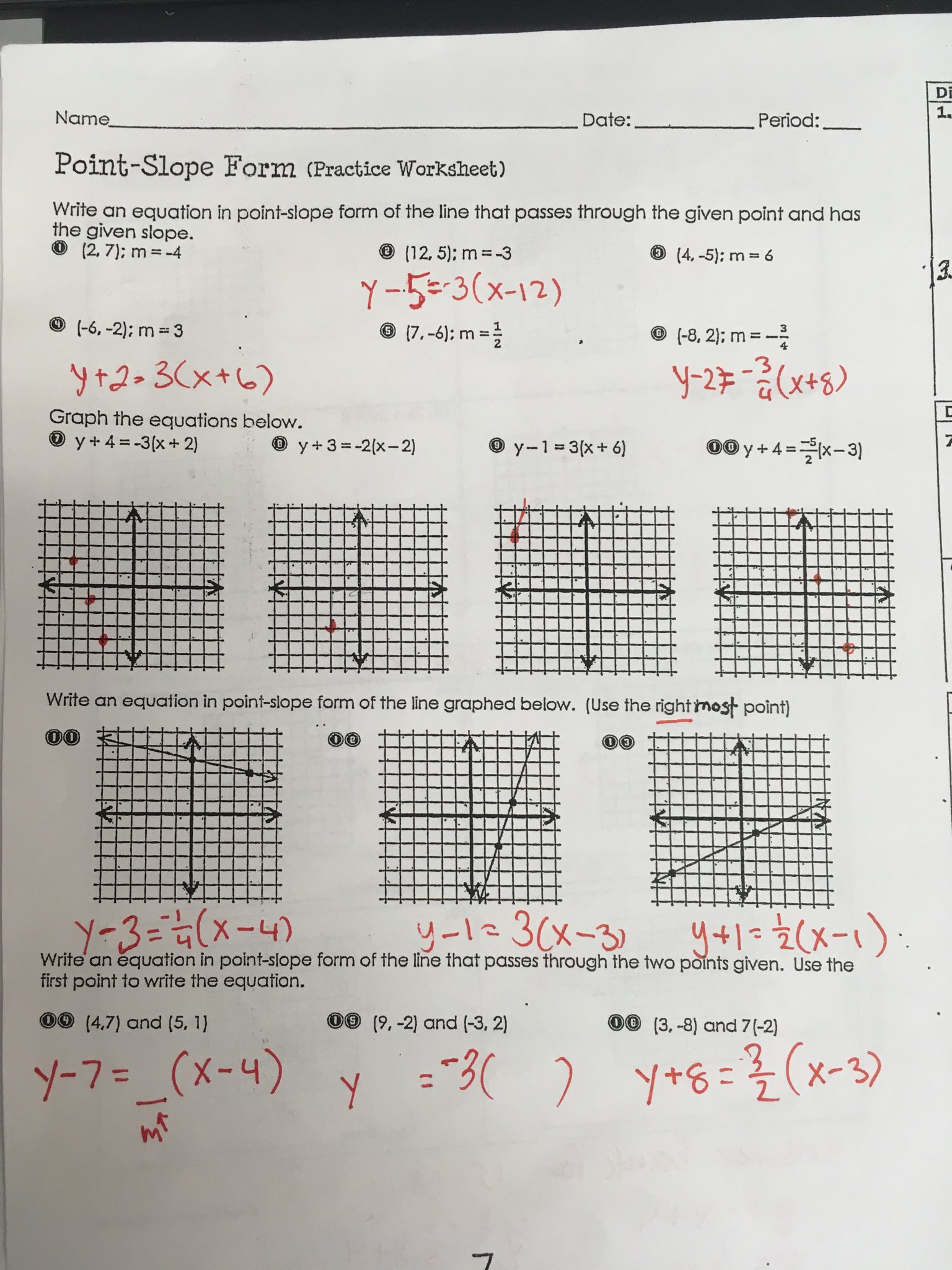 PDF Point-Slope Form (Practice Worksheet) - sybilnelson.com Write an equation in point-slope form of the line graphed below. (Use the right hand point) Write an equation in point-slope form of the line that passes through the two points given. Use the first point to write the equation. (4,7) and (5, 1) (9, -2) and (-3, 2) (3, -8) and 7(-2)