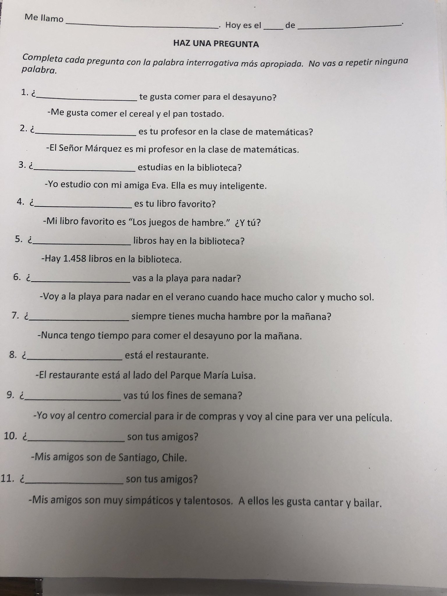 Spanish Question Words Worksheet | SpanishBoat Spanish for Kids / Beginners PDFs Choose the correct options to complete the following Spanish Question Words Worksheet. 1. ¿ camisas tienes? 2. ¿ quieres ir de vacaciones? 3. ¿ son estos libros? 4. ¿ estás haciendo aquí? 5. ¿ no me has llamado? 6. ¿ es su nombre? 7. ¿ es tu mamá? 8. ¿ necesitas las llaves? 9. ¿ fecha es hoy? 10.