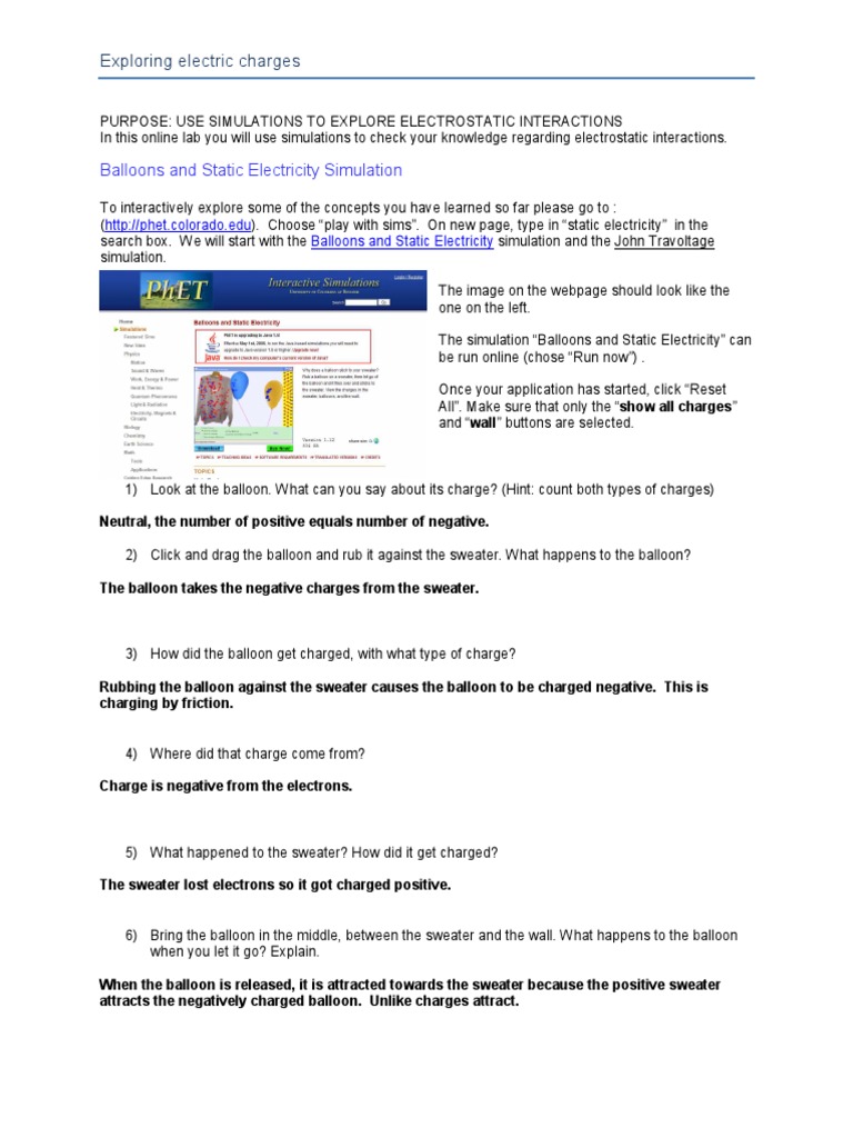 Static Worksheet Answers | PDF | Electric Charge | Electricity - Scribd Answer questions #1-3 using COMPLETE SENTENCES!!! 1. Play with the simulation and observe what happens when the balloon is rubbed on the sweater. Explain why this happens. Friction results in electrons being transferred from the sweater to the balloon. 2. The process you completed in #1 is a called charging an object by friction. Bring your