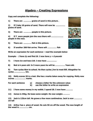 Algebraic Expressions Worksheets | Translate Phrases Worksheets Memo Line for the Algebraic Expressions Worksheet. You may enter a message or special instruction that will appear on the bottom left corner of the Algebraic Expressions Worksheet. Algebraic Expressions Worksheet Answer Page. Include Algebraic Expressions Worksheet Answer Page Variable and Verbal Expressions - Kuta Software Variable and Verbal Expressions Date_____ Period____ Write each as an algebraic expression. 1) the difference of 10 and 5 10 − 5 2) the quotient of 14 and 7 14 7 3) u decreased by 17 u − 17 4) half of 14 14 2 5) x increased by 6 x + 6 6) the product of x and 7 x ⋅ 7 7) the sum of q and 8 q + 8 8) 6 squared 62 9) twice q 2q Algebraic Expressions Worksheets - Online Practice | Download ... Also, check: Algebraic Expressions and Equations. For more details on algebraic expressions worksheets, algebraic identities and solutions, you can refer to the below algebraic expressions worksheet to excel in your examination. Worksheet on Algebraic Expression. Solve the algebraic expression problems given below: Writing algebraic expressions | Teaching Resources Writing algebraic expressions. Subject: Mathematics. Age range: 11-14. Resource type: Other. 5 3 reviews. ciaranfinn. 4.282978723404256 271 ... pptx, 1.19 MB pdf, 1.04 MB. General Powerpoint and associated example and worksheet. Answers provided. Creative Commons "Sharealike" Reviews. 5 Something went wrong, please try again later. deejohnson ...