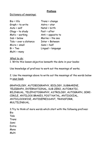 Suffixes And Prefixes Handouts Teaching Resources | TPT In this download, there are five prefixes and suffixes word sort activities. Each activity includes a variety of prefix and suffix word parts. This activity is designed to help students gain exposure to word parts that will help them decode the meaning of larger words. Included: - 5 Pages of Prefixes & Suffixes Word Sort Cut & Pas 96 FREE Prefixes/Suffixes Worksheets - Busy Teacher Learning prefixes and suffixes can help students guess the meaning of new or unfamiliar words which is a valuable skill. There are currently 96 worksheets to help you teach students about prefixes and suffixes and give students more practice using them. Let's take a look at a couple of the worksheets from this section. Prefixes and suffixes worksheets and online exercises Grade/level: CAE 3. by Marverar_. Prefixes and suffixes listening. Grade/level: Pre intermediate. by sdperezr27. Prefixes and suffixes. Grade/level: Tercero Primaria. by MarthaFL. B2-C1 prefixes and suffixes. DOC Scientific Prefixes & suffixes - Chandler Unified School District Prefix-Suffix Worksheet Define the following terms using your prefix-suffix list. Underline the prefix &/or suffix in each biological term. Example: THERMOMETER - therm means heat & meter means measure of so a thermometer is an instrument used to measure heat. 1. Biology 2. Osteocyte 3. Dermatitis 4. Epidermis 5. Hematology 6. Herbicide 7.
