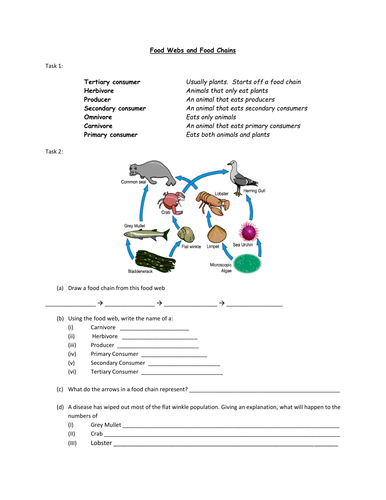 Food chains and webs worksheet. Food chains & food webs (article) | Ecology | Khan Academy How food chains and food webs represent the flow of energy and matter. Trophic levels and efficiency of energy transfer. Sheppard Software: Fun free online learning games and ... Hundreds of fun educational games and activities for kids to play online. Topics include math, geography, animals, and more. Food Chains and Food Webs - US EPA following worksheet. MATERIALS: 1. Producers, Consumers and Decomposers student worksheet 2. Diagram of marine food web 3. Producers, Consumers and Decomposers teacher answer sheet 4. Pencils PROCEDURE: 1. Introduce or review the concepts and vocabulary for food chains and food webs. 2. Pass out the sheets for students to complete. 3. Discuss ... Food Chain Worksheets - Super Teacher Worksheets In addition to ecosystems and food chains, these printable worksheets also cover consumers and producers, as well as herbivores, carnivores, and omnivores. Food Web Worksheet FREE Learn how energy is transferred from one living thing to another with the food web.
