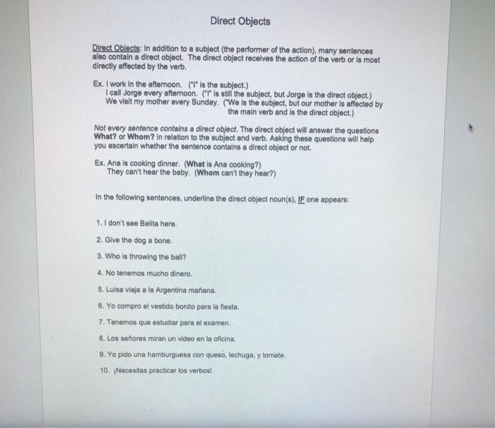 Regular Spanish verbs practice Practice regular verbs in the … Fully customizable, practice as many or few tenses as you want! ConjuguemosNov 04, 2022 · Spanish numbers worksheet; Spanish verbs worksheet; Beginner body parts in Spanish worksheet; Subject pronouns Spanish worksheet; The six linked sites above provide free, downloadable beginner Spanish worksheets. After you master these subjects, browse ... Spanish 3 – Easy Peasy All-in-One High School Learn about using direct and indirect object pronouns in Spanish. Copy sentences to practice. Lesson 98. Practice with the direct and indirect object pronouns. More practice; Lesson 99. Complete the exercises on the direct and indirect objects. one, Record your score out of 10. two, Record your score out of 8. (potential for extra credit)
