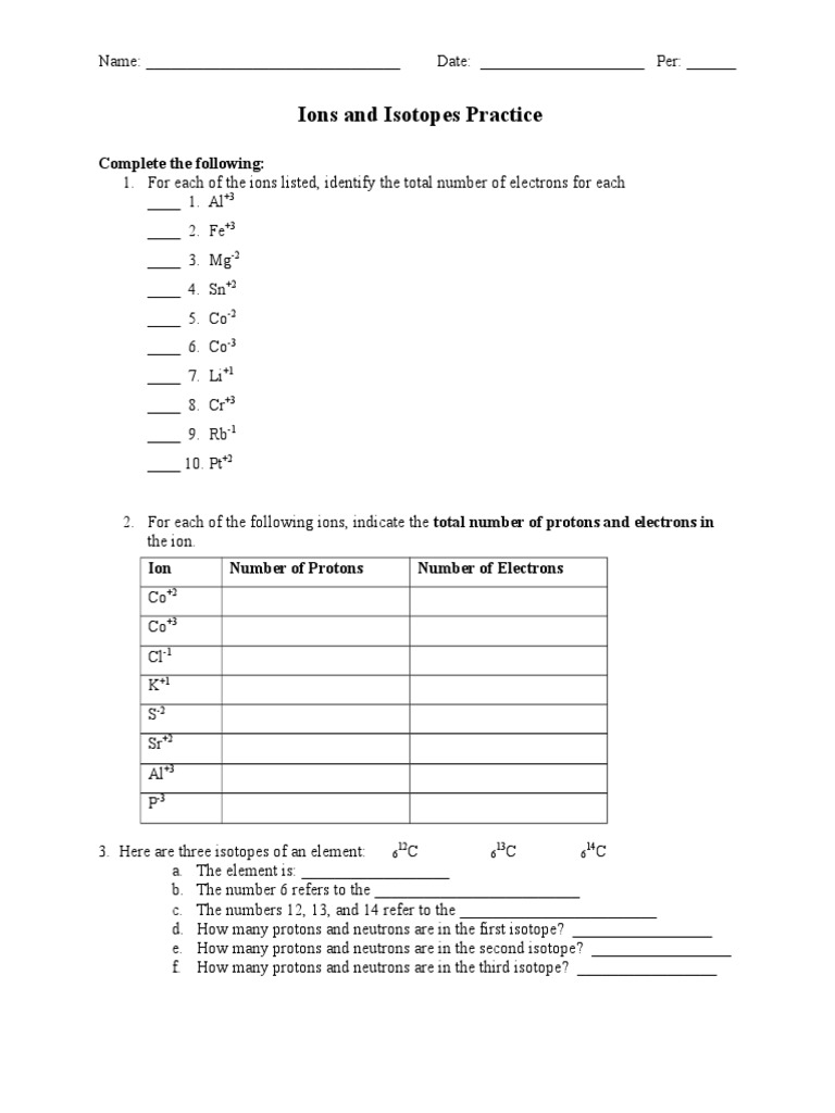Isotope and Ions Practice Worksheet - The Wesley School For each of the positive ions listed in column 1, use the periodic table to find in column 2 the total number of electrons that ion contains. The same answer ...